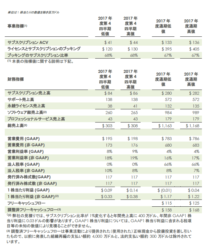 2017年9月30日に終了する第4四半期と2017年度通期に関するPTCの予測値: