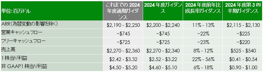 タルビティは、「今年度のこれまでの実績と下半期の見通しを反映させるべく、2024 年度 の為替変動の影響を除いた ARR のガイダンス幅を狭め、2024 年度 のフリーキャッシュフローのガイダンスを維持するものとします。第 3 四半期の ARR ガイダンスの範囲は 11~12 % の拡大、フリーキャッシュフローは約 2 億 2,000万ドルとなります。また、ARR ガイダンス範囲の更新と為替変動の影響に合わせて2024 年度の売上高および1株当り利益のガイダンスを更新したということも注目に値すると考えます。2024 年度第 3 四半期および 24 年度通期のガイダンスは適切なレベルに設定できたと考えています」と締めくくっています。