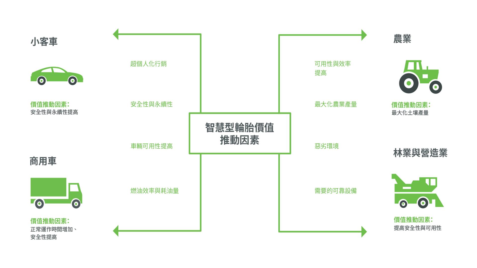 雖然相關法規推動了 TPMS 的採用,但重點是安全性和燃油經濟性的考量,而不是輪胎性能或下一代輪胎設計。因此,智慧連網輪胎的真正潛力仍在探索中。只知道胎溫或胎壓是不夠的;橡膠輪胎採用智慧科技能發揮的潛力遠不只如此。此外,智慧連網輪胎也採用搖籃到墳墓的替代方案,以確保報廢時的環保使用。